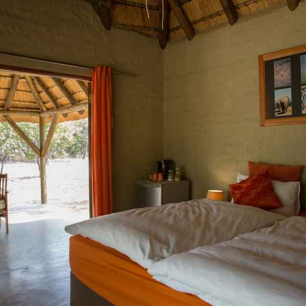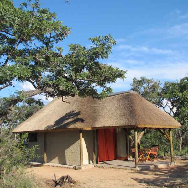 One room, approx. 40m² luxury thatched lodge with en-suite bathroom, close to the swimming pool and the Lounge area. Private covered veranda, own entrance. Powered with a combination of solar and Eskom. Free coffee & tea facilities, stocked bar fridge and snack basket, both based on the honesty bar principle.