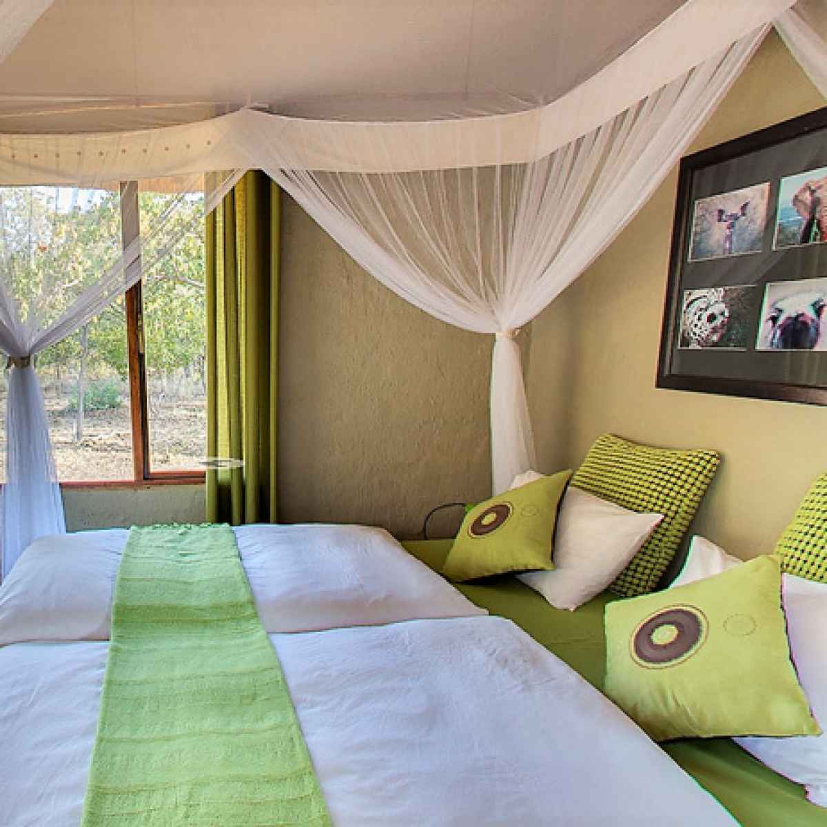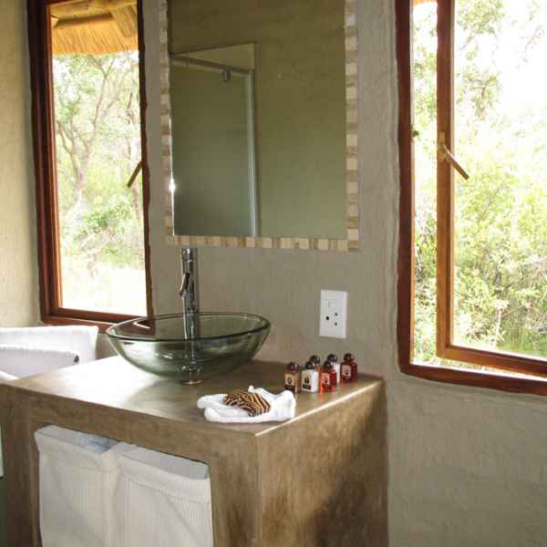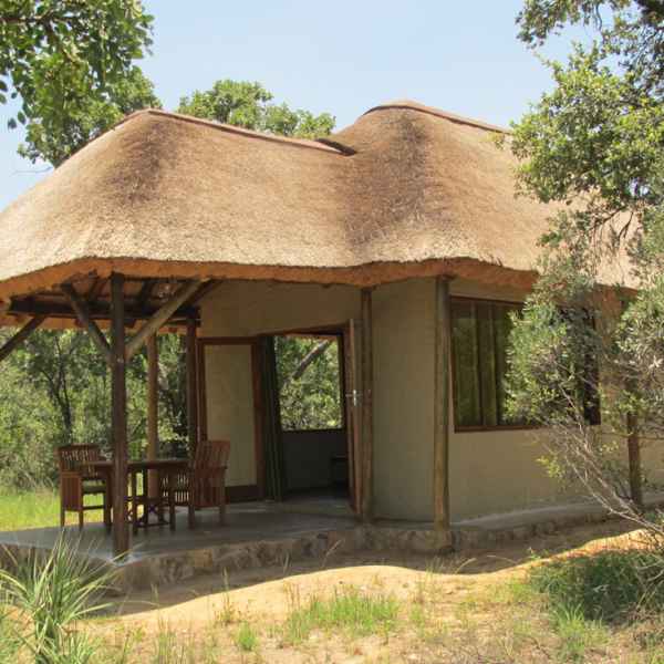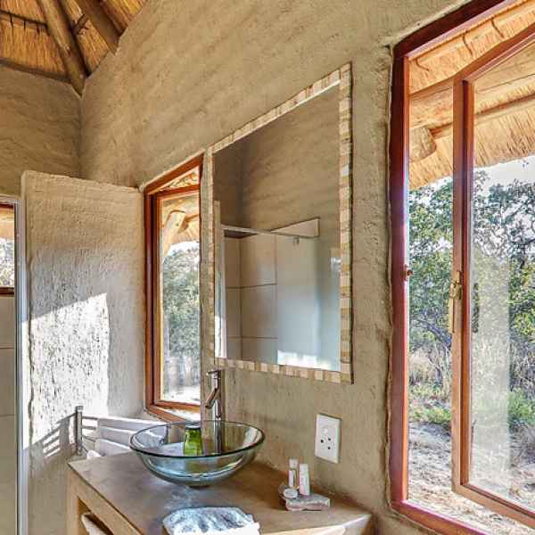 One room, approx. 40m² luxury thatched lodge with en-suite bathroom, close to the swimming pool and the Lounge area. Private covered veranda, own entrance. Powered with a combination of solar and Eskom. Free coffee & tea facilities, stocked bar fridge and snack basket, both based on the honesty bar principle.